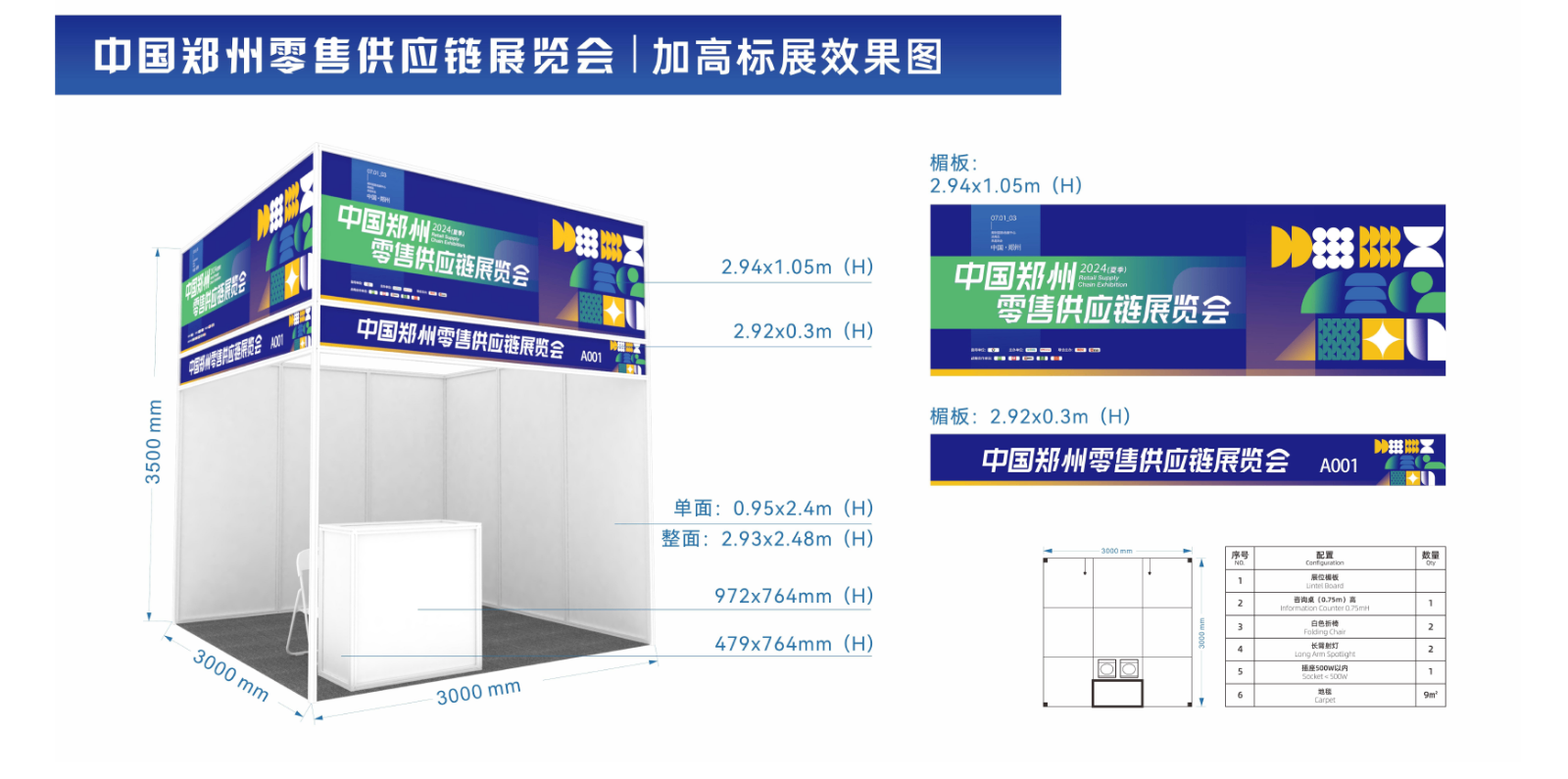 展出场地、三面展板(高2.5m)、一块中英文楣板、一张洽谈桌、二把椅子、地毯、220V电源插座一个、二支射灯。